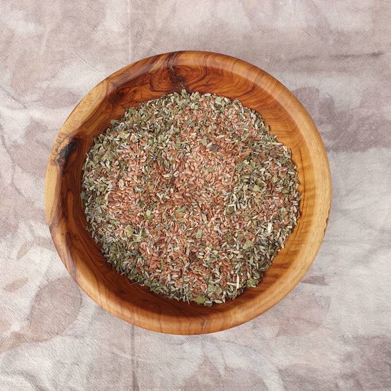 Een handgemaakt kussentje van biologisch katoen met een ecoprint van bladeren. Gevuld met biologische kruiden en lijnzaad.