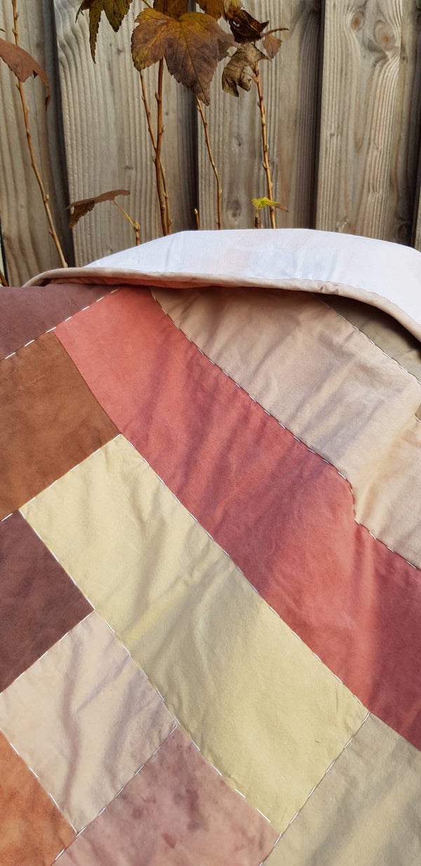 Handgemaakte log cabin quilt. Heerlijk zachte deken in verschillende natuurlijke kleuren voor in de kinderkamer, knus op de bank of om mee op reis te nemen.